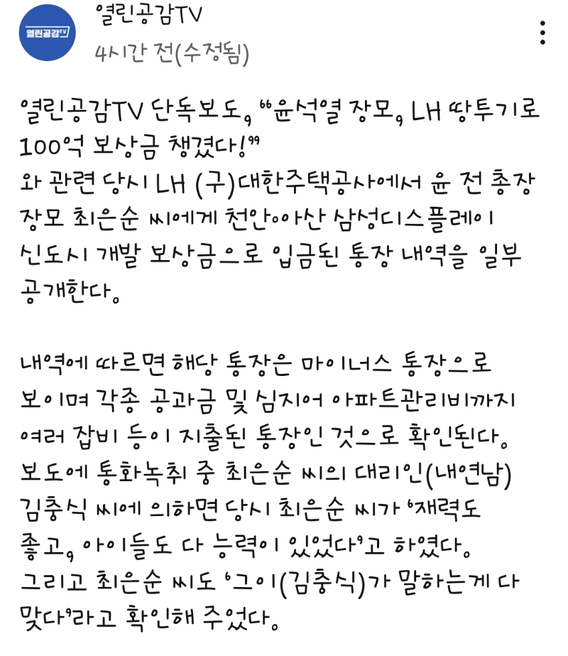 윤석열 장모 LH 땅투기 보상금 논란 기사 전문