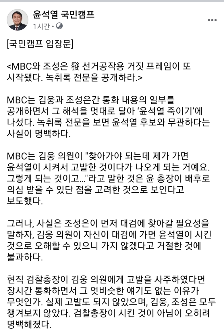 윤석열 국민캠프 입장전문 MBC와 조성은 發 선거공작용 거짓 프레임이 또 시작됐다. 녹취록 전문을 공개하라