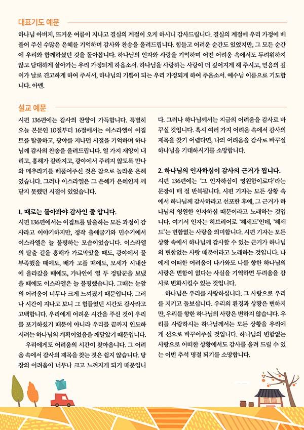하나님은 우리를 사랑하십니다. 그 사랑으로 우리를 지키고 돌보십니다. 우리의 환경과 상황은 변하지만, 우리를 향한 하나님의 사랑은 변하지 않습니다. 우 리를 사랑하시는 하나님께서는 모든 상황을 우리에게 선으로 바꾸어주실 것입니다. 하나님의 변함없는 사랑으로 어떠한 상황에서도 감사를 올려 드릴 수 있는 이번 추석 명절 되기를 소망합니다.