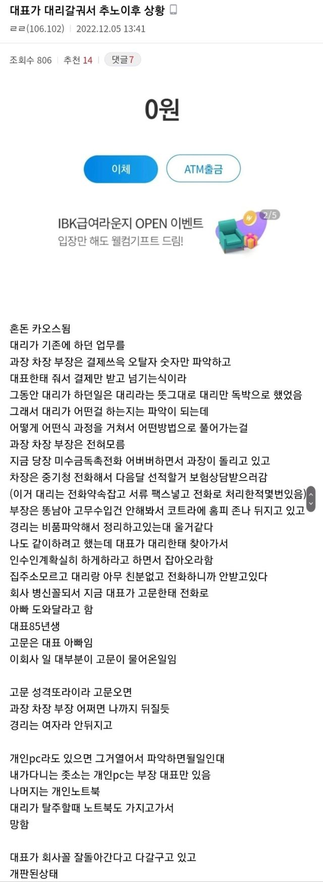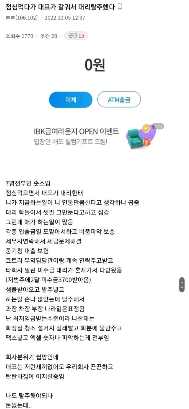 점심먹다가 대표가 갈궈서 대리가 탈주한 글+후기
