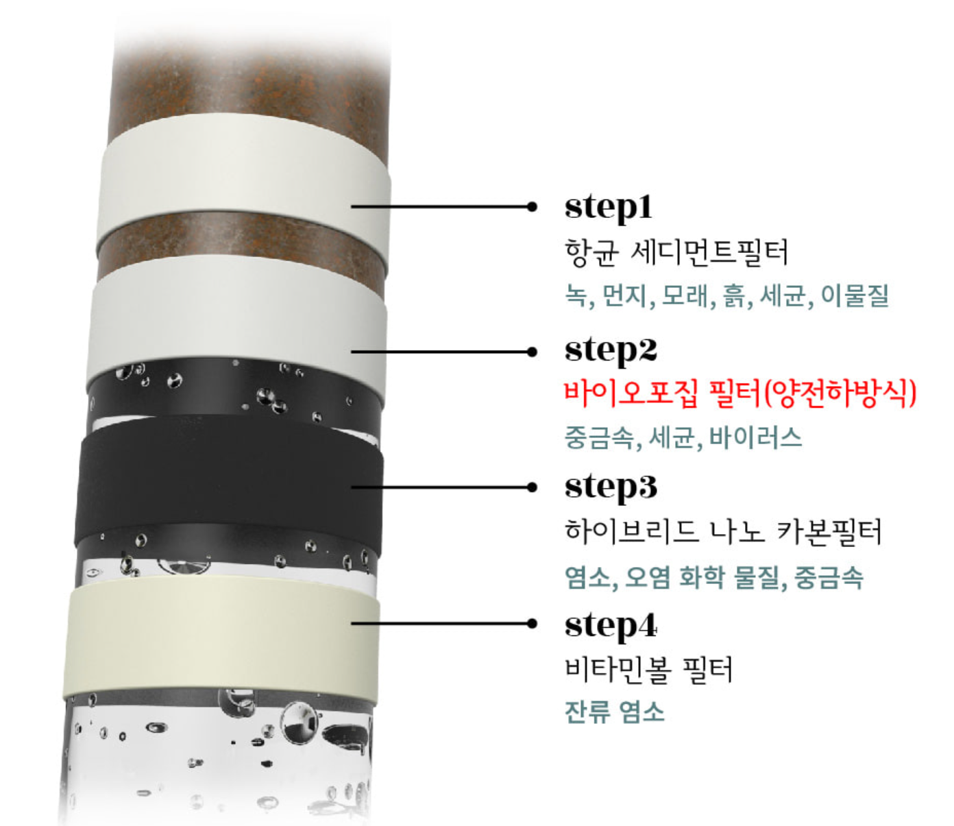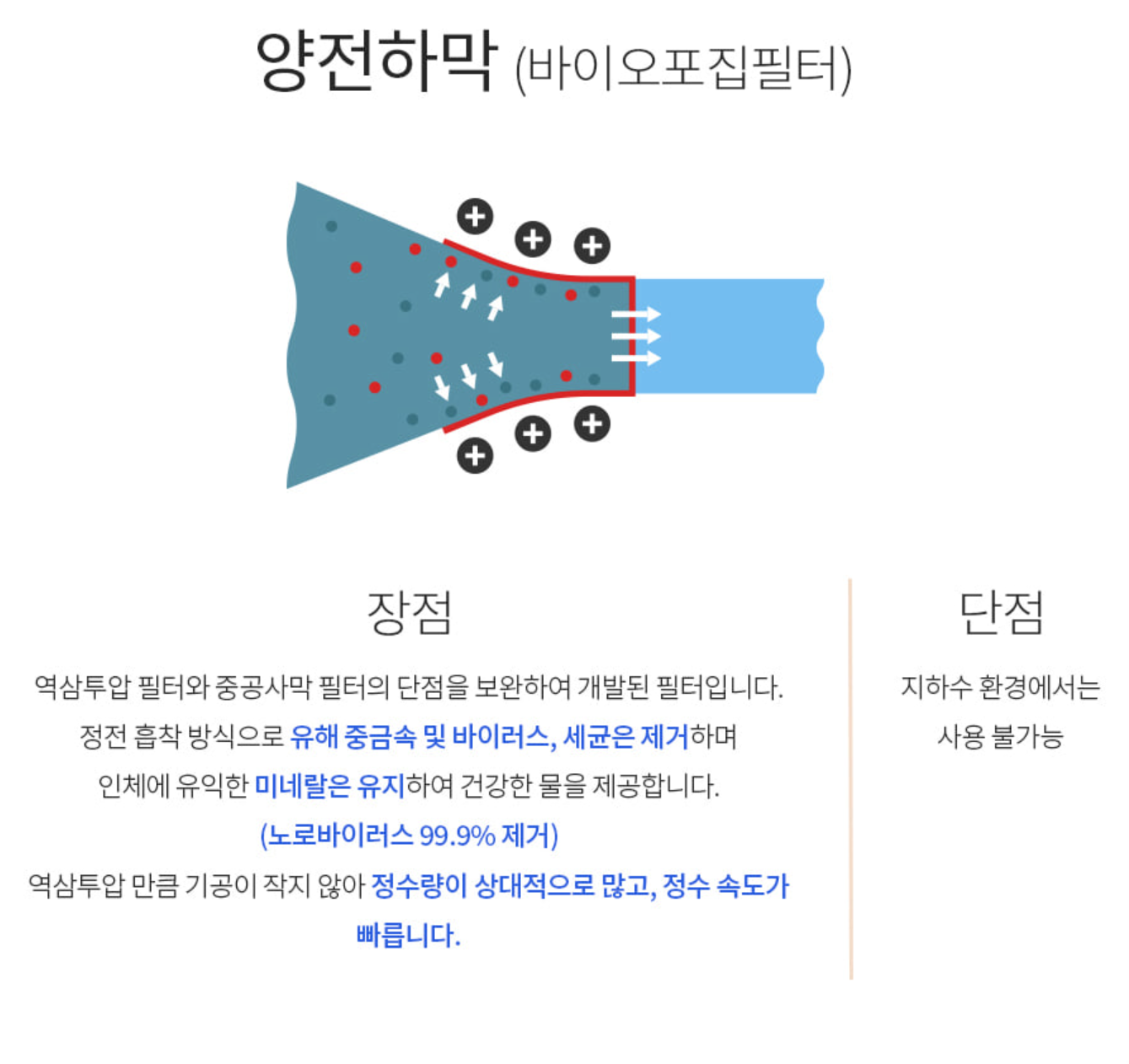 양전하를 이용한 역삼투압 방식 필터입니다. 정전흡착방식으로 유해 중금속 및 바이러스, 세균은 제거하고 인체에 유익한 미네랄은 유지합니다.